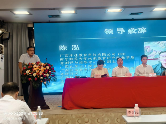 广西泽桂教育科技有限公司CEO、南宁师范大学未来教育研究院教学质量测评与指导中心常务副主任陈泓致辞。他提到公司在教育服务领域深耕十余年,拥有丰富的经验和专业的技术人才队伍。此次与南宁师范大学合作成立教学质量测评与指导中心,将充分发挥双方的优势,共同推动广西基础教育的高质量发展。